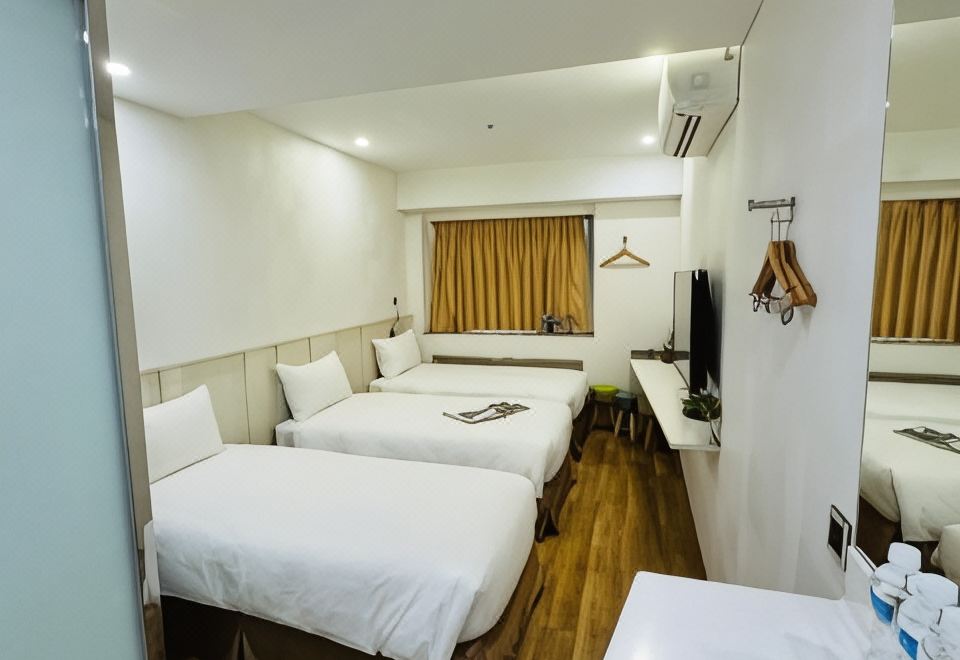 Small hotel in Japanese room style, clean, compact space for three people. Good location close to Taipei main station, easy to find hotel on the fifth floor in the same building of McDonald's and can walk to Ximenting or train and bus station conveniently. Hotel service includes a shared kitchen, simple breakfast like toast, peanut butter jam and coffee for free 7 -11 am daily. Just across the road I found a Japanese restaurant with good taste and reasonable prices. From here I ride a bus/mrt to the temple, museums and night market easily too.