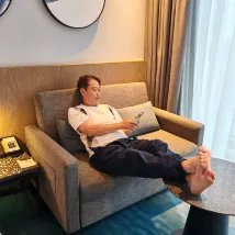 Flight got cancelled while it was already late in the evening, so decided to stay here for the night instead of staying in Taipei city. The hotel was 15 minutes away from the airport, and taxis and UBER were more than willing to send us (though cheaper to take a taxi). Staff were wonderful and spoke great English. Room was clean and beds so comfortable. Bathroom was huge and had a good sized tub. Ample space for four people to move around, it had a long table, great channels on TV. The business center was open and had comfortable sofas and seats including snacks, drinks and coffee. It was right across the laundry room, so I hung around at the center while waiting for my laundry to finish. I managed to use the laundry facilities. There was only one washer and one dryer so I felt I was extremely lucky that I did not have to wait to use them. There was a family mart next door and a 7-11 around the corner. Both fully stocked and had good options. Unfortunately I did not manage to check out the surround area (shopping outlets, aquarium etc) but I can definitely stay here again for a night or two next time before flying home.