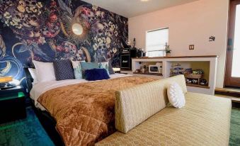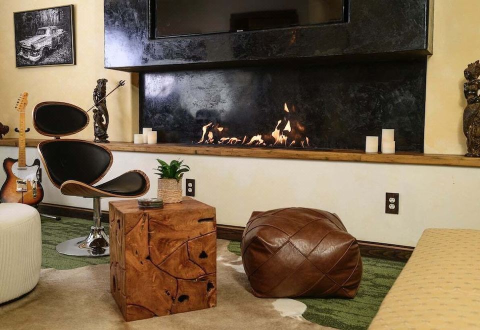 Every detail of The Farmhouse Suite has been thoughtfully curated using reclaimed, eco-friendly materials. Indulge in the spacious rainfall Tadelakt shower or enjoy the handcrafted marble sink from Spain, complemented by a French Designed Dragon Head Faucet. Set the perfect ambiance with customizable mood lighting and relax by the 48-inch bio-fuel fireplace. For entertainment, unwind with a Sonos Spatial audio speaker and a 75-inch TV, or savor the view from your private patio with a covered awning. Coffee lovers will appreciate the Nespresso, Keurig, and traditional coffee maker, complete with pods and free snacks. Plus, a tankless water heater ensures you never run out of hot water.