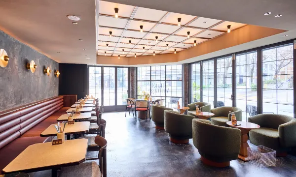 The first floor has floor-to-ceiling windows. I especially liked the first-floor café; in the morning, you can choose a bread roll, and each person also gets a salad, coffee, and soup. It was raining outside, and having breakfast on the first floor of the hotel was very pleasant.