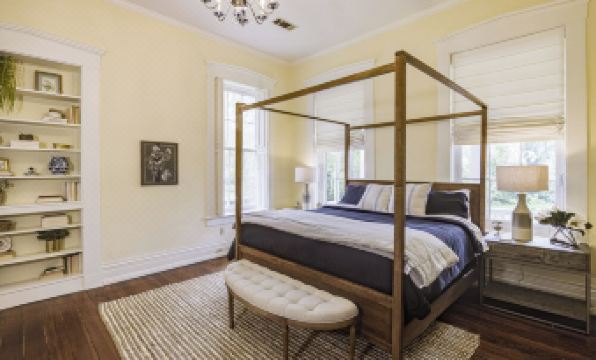 Head upstairs to the second floor, where three spacious bedrooms with 14-foot ceilings and king-size memory foam beds await. One bed even has original Civil War-era posts—if you look closely, you can still see saber marks! There’s also a comfy living room with a big smart TV and a door that leads out to the beautiful gallery porch.