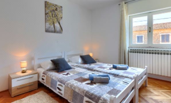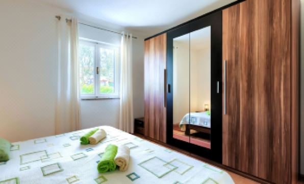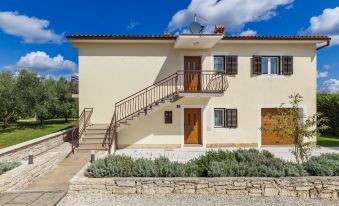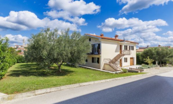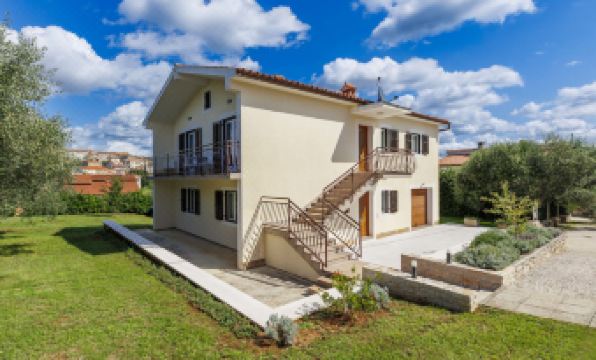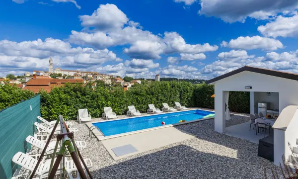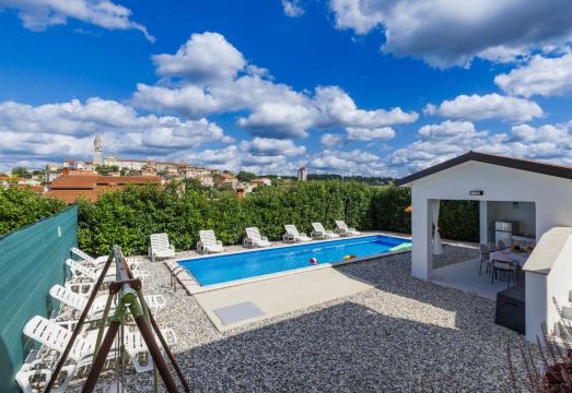 Single-family house "Jurican", 2 storeys. 1 km from the centre of Višnjna, 5 km from the centre of Kaštelir, 10 km from the centre of Poreč, 10 km from the sea. Private: property 1'200 m2 with lawn and trees, swimming pool heated (8 x 4 m, seasonal availability: 27.Mar. - 05.Nov.). WC in the pool area, shower/WC in the pool area, outdoor shower, terrace, barbecue, pool maintenance by the owner/gardener. In the house: internet access, washing machine. Parking (for 4 cars) on the premises. Shop 1 km, bus stop 8.6 km, pebble beach 10 km. On request: airport transfer to the holiday accommodation. Please note: airfield 50 km from the property. The house consists of 2 apartments rented as one unit. ,Swimming pool heated (extra). 7-room house 155 m2 on 2 levels. Living/dining room with 1 double sofabed and satellite TV (flat screen), air conditioning. 1 room with 1 french bed (190 cm, length 200 cm). 1 room with 1 bed. Open kitchen (4 hot plates, dishwasher, microwave, freezer, electric coffee machine). Bath/WC. Air-conditioning, forced-air heating. Upper floor: (exterior staircase) living/dining room with satellite TV (flat screen), air conditioning. Exit to the balcony. 1 room with 1 bed and 1 french bed (180 cm, length 200 cm). 1 room with 2 beds. 1 room with 1 bed. Open kitchen (4 hot plates, oven, dishwasher, microwave, freezer, electric coffee machine). Bath/WC. Air-conditioning, forced-air heating. Balcony, terrace 30 m2. Terrace furniture, balcony furniture, deck chairs. Facilities: iron. Internet (WiFi, free). Please note: non-smoking house.