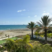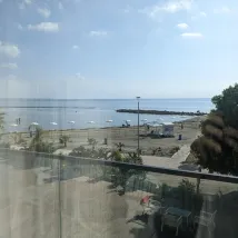 On the edge of town (Larnaka), so caters more for people with cars (ample parking). Still, nice seafront walk for a few miles and a few beachside coffee shops. Public beach right outside, shallow water and sandy once inside water. Very new hotel, so good value for money, especially when booking rooms with Seaview balcony. Staff at restaurant very nice. Ran out of something can gave me free alternative drink. (photos of beach outside hotel, including view from room)