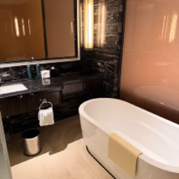 Great location, but the hotel itself is a bit dated. The facilities aren't as new as some other hotels. However, the service is absolutely top-notch! The front desk staff were incredibly friendly and kind to my kids. We even received a welcome gift upon check-in – some delicious small cookies from Macau's famous Koi Kei Bakery, which my children loved. The 6th-floor indoor heated pool is a nice bonus, though the changing rooms were a bit messy. Not a big deal since we could just go back to our room to change. There are plenty of dining options nearby, so no need to stick to the hotel breakfast. The dim sum at the 55th-floor restaurant is excellent. While it's a bit far from the popular internet-famous spots, the surrounding area is perfect for a leisurely stroll, with lots of charming little shops and cafes for afternoon tea. It has a chic, boutique vibe. Five-star recommendation!