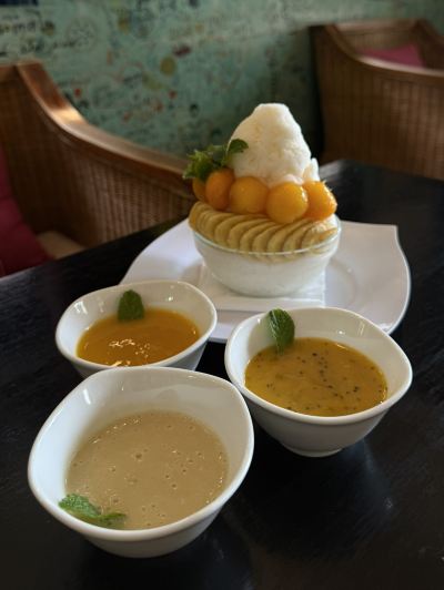 I found this restaurant by following the map, and it didn't disappoint me. The shaved ice is smooth and melts in your mouth. The pancakes are crispy and soft, and paired with sour and sweet sauce, it's delicious and not greasy. The cheese cold noodles are a must-order in midsummer, paired with half-cooked eggs, and the egg yolk is mixed with cheese, which has a unique flavor and is very distinctive. The only drawback is probably the mango. After eating at several restaurants, I found that the mango tastes not very good, neither sour nor sweet. Maybe Cambodian mangoes are not as good as Thai mangoes... The price is 5 or 6 dollars. So, eating here is really not cheap... I'd better go to Thailand in the future.