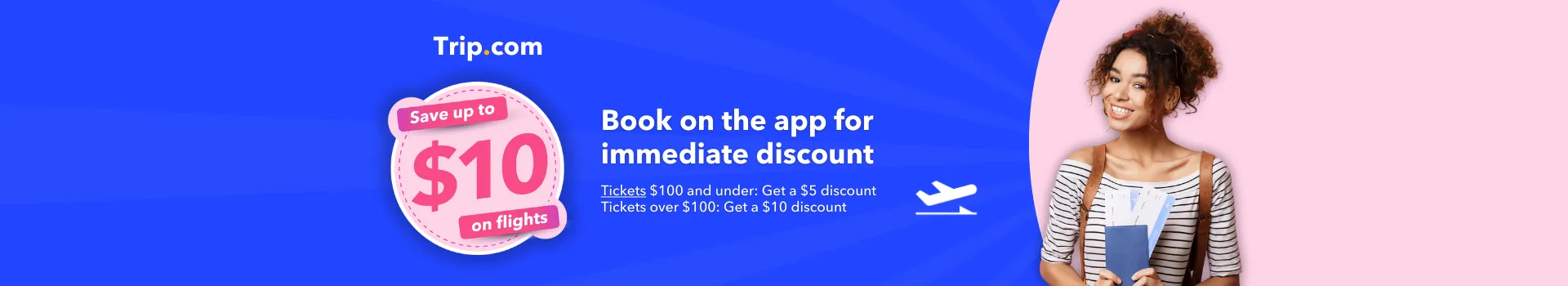 The following app exclusive prices are available on the US version of the Trip.com app: flights priced at or below $100.00 are eligible for a discount of $5.00, while flights priced over $100.00 are eligible for a discount of $10.00. A minimum payment of $1.00 per passenger is required. Please note that this discount applies to one-way, round trip and multi-city bookings on selected flights only.