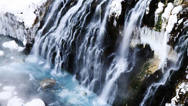 ▲ Shirahige Waterfall is a magnificent waterfall located in Biei, southeast of Asahikawa. White cascades of water splash down through cracks in the cliff, creating a "white beard waterfall"-like scene, which is also the origin of this natural attraction's name. Rime ice and sparkling icicles light up, illuminating the blue valley below, making the waterfall's winter view particularly captivating.