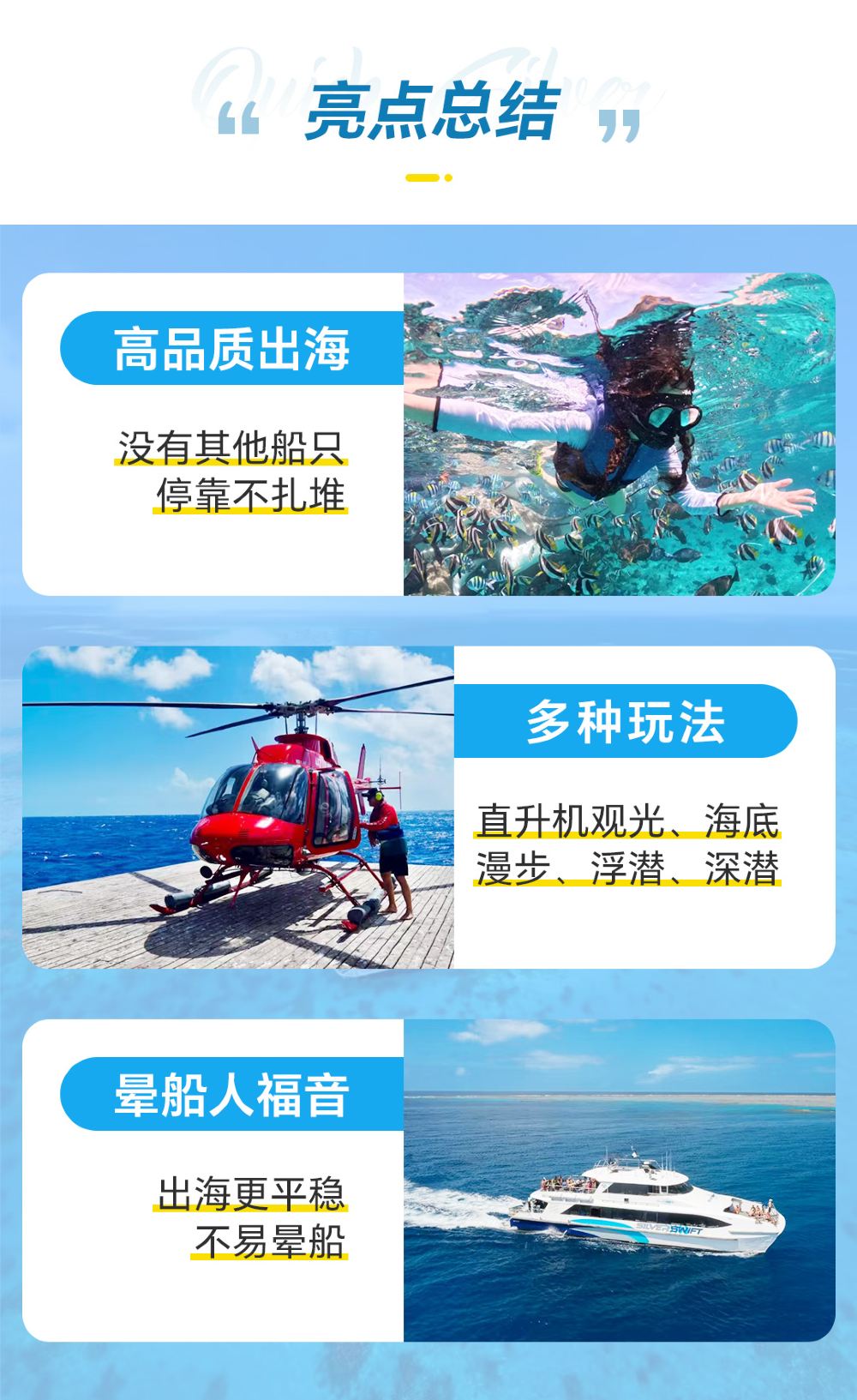 Superior destination quality - Take you to reef areas with clearer waters and more pristine coral views to experience the magnificence of the Great Barrier Reef