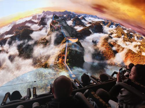 Fasten your seatbelt under the staff's guidance as the seat slowly rises. The surrounding lights gradually dim, and the giant circular screen completely envelops your field of vision.