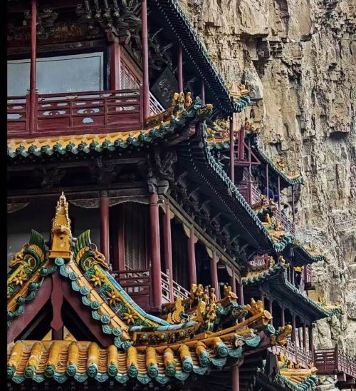 ▲ Originally named "Xuankong Pavilion," it was designed to welcome celestial beings and transcend worldly disturbances. Nestled on the cliffs of Cuiping Peak along the western side of Mount Heng's Jinlong Gorge, this temple dates back to the late Northern Wei Dynasty (491 AD). Supported by just a few wooden beams, it has miraculously stood for over 1,500 years, embodying a unique fusion of Buddhism, Taoism, and Confucianism. Renowned for its breathtaking architecture perched precariously over an abyss, it is listed among the world's top ten most precarious structures and remains the earliest surviving wooden architectural complex built on sheer cliffs. The great poet Li Bai inscribed the words "Magnificent" in its honor.