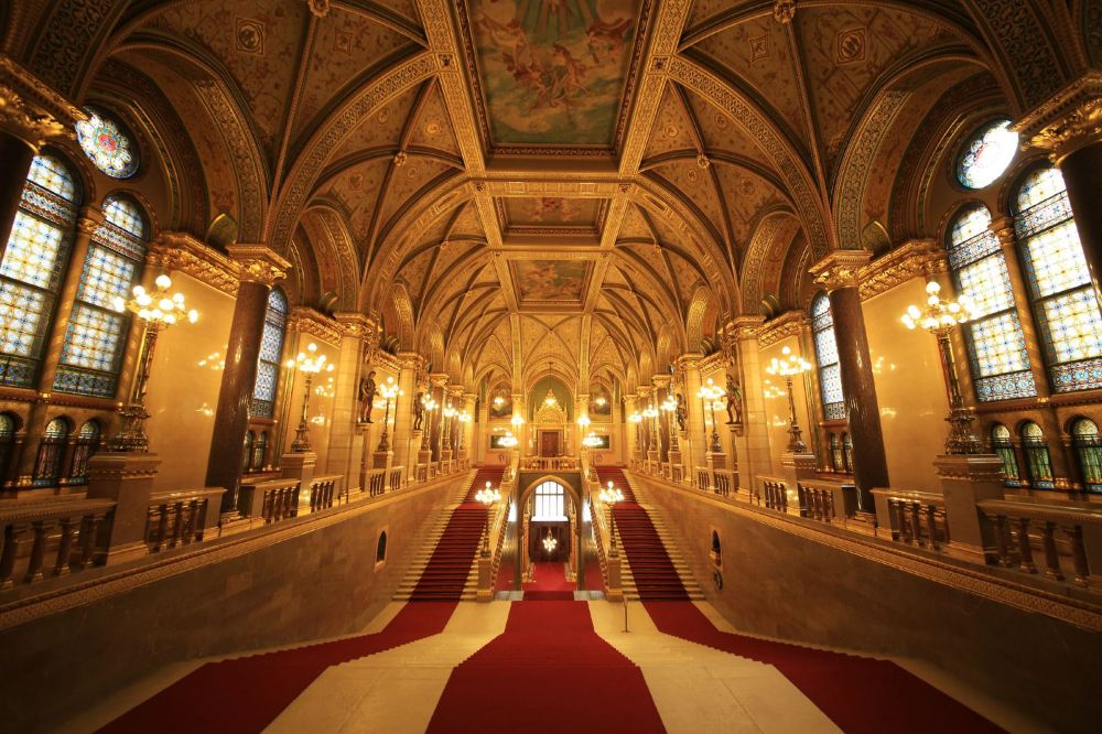 ▲ The building complex consists of a total of 691 halls and rooms, with 27 gates leading to ten courtyards, and staircases stretching over 20 kilometers in total length. The main halls are adorned with portraits and murals of famous figures from Hungarian history. The exterior walls are decorated with 88 sculptures. The Munkácsy Hall also displays large-scale paintings by renowned Hungarian artists.