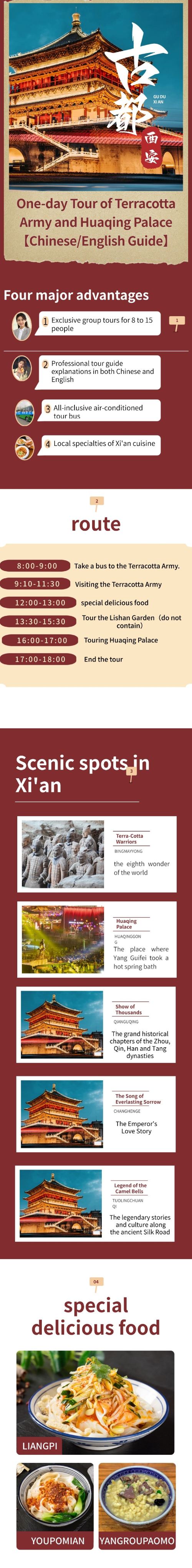 ① Chinese package adult price includes attraction tickets with no need for secondary reservation. Children's price only includes half-price admission to Huaqing Palace. Senior fees do not include Emperor Qinshihuang's Mausoleum Site Museum (Terracotta Warriors) or Huaqing Palace tickets!