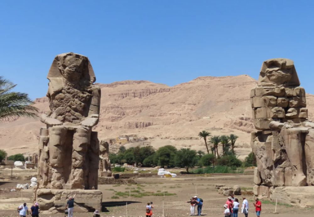 ▲ Gaze up at the two colossal seated pharaoh statues standing in the fields, remnants of a vanished temple, and listen to the ancient legend of how they once "sang" due to historical erosion.