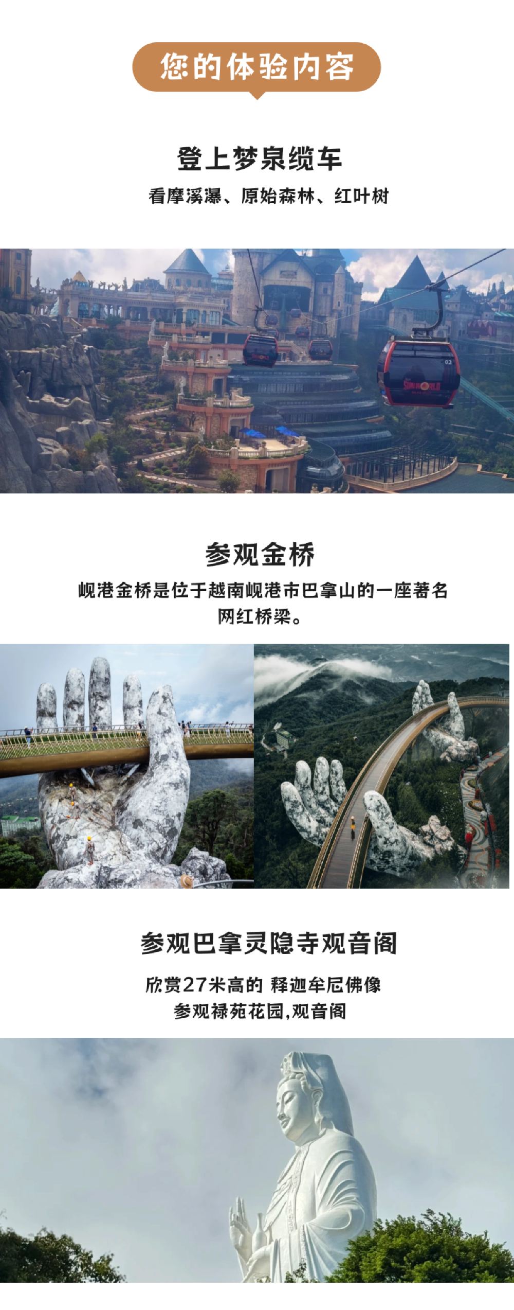 Attractions: Visit the Golden Bridge, explore the Le Jardin district with its French heritage, tour the Banalingyin Temple, and admire the 27-meter-high statue of Sakyamuni Buddha