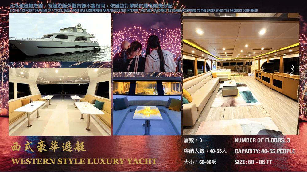 Western-style luxury yacht: Sleek lines paired with lavish interiors, a comfortable lounge and spacious deck create unforgettable fireworks memories.