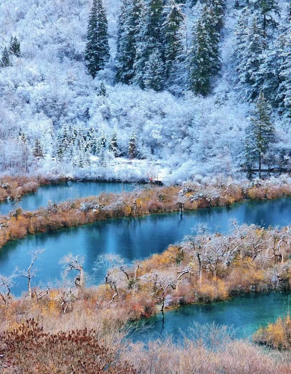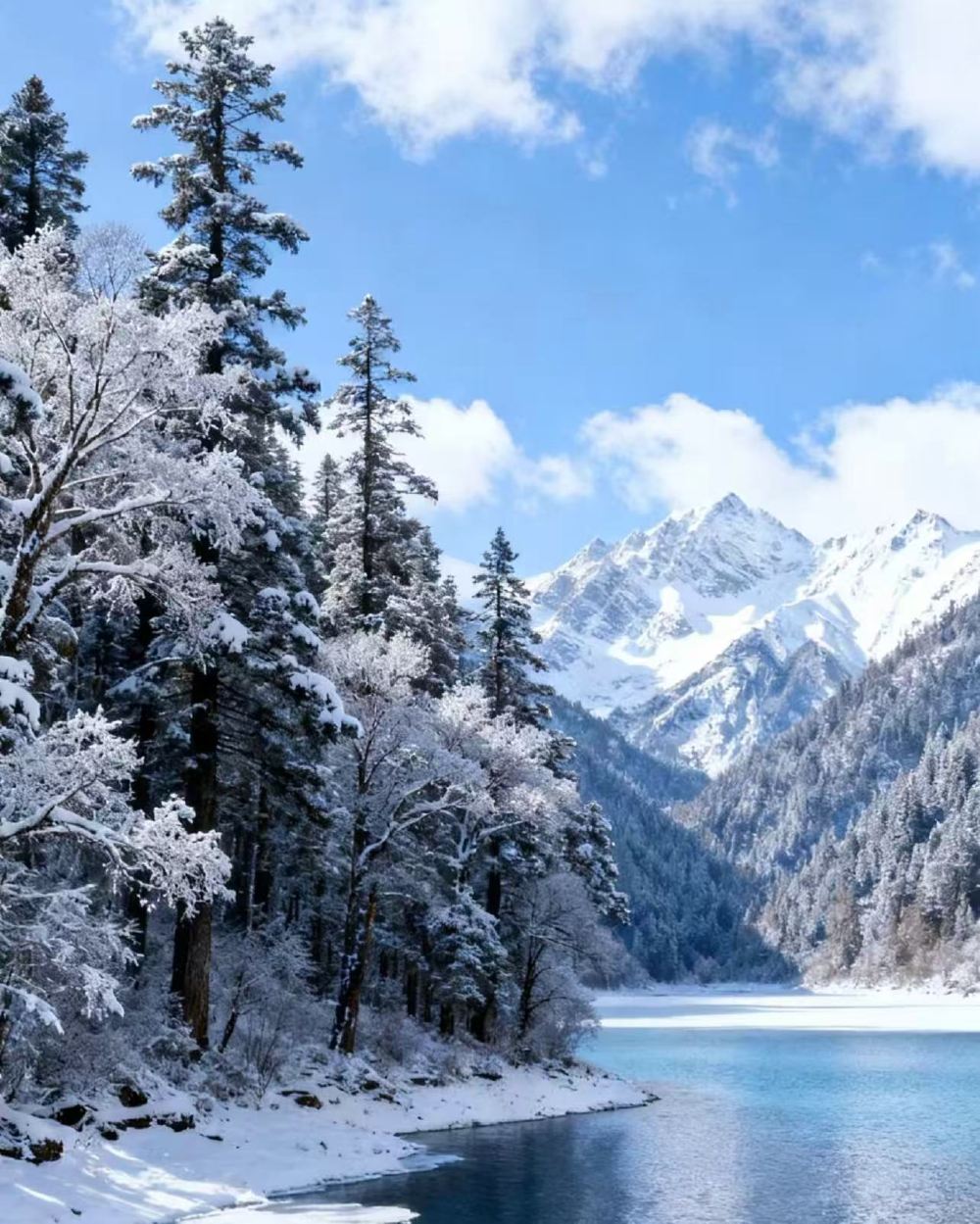 ▲ The peaks and forests are draped in pristine white snow, resembling an elegant ink wash painting. The lakes present unique vistas—some surfaces thinly iced with deep azure waters visible beneath, creating a dreamlike interplay of ice and water. Long Lake appears even more profound and tranquil against the snowy backdrop, with white-capped mountains contrasting its sapphire hues like a breathtaking masterpiece. This serene scenery uplifts the spirit, as if all worries have melted away.