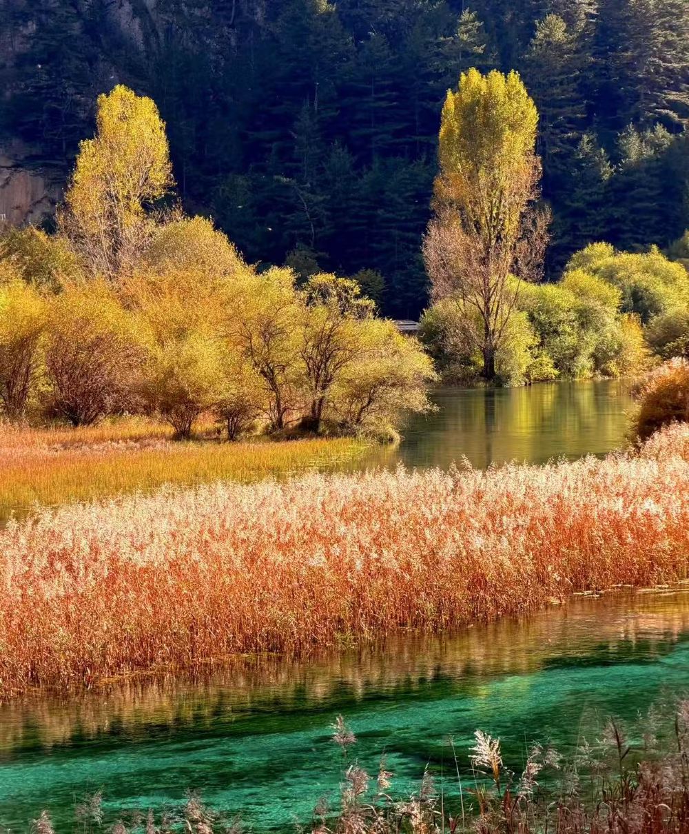 ▲ The golden reeds shimmer in the sunlight, swaying with the wind, while the emerald-green Haizi flows like a ribbon gently meandering through the soft reed sea. The distant trees are also bathed in a golden glow, creating a scene as beautiful as an oil painting.