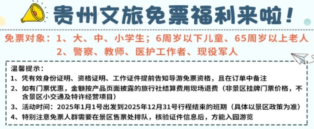 15:30 Return to designated point: Return to Guiyang Yunyan District Old Bus Station/Bus Station by Bus and end the tour Return to Guiyang by vehicle to conclude the trip. Reminders: 1. The itinerary duration is for reference only. Due to uncontrollable factors such as holiday crowds, the actual sightseeing time will be adjusted accordingly. Please ensure travelers adhere to the agreed schedule. 2. Given frequent traffic congestion in Guiyang, to avoid delays, we recommend not booking same-day return flights/trains. Refund Policy: - If you hold eligible discounted/free admission passes recognized by the attraction, please bring valid ID for verification. The guide will process on-site refunds accordingly. - The complimentary Miao ethnic costume photo experience is non-refundable if unused. Travel time: Approx. 3 hr(s)30 min(s)