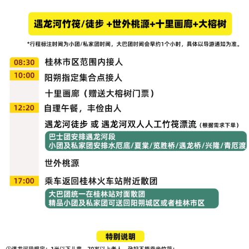 7. During holidays, especially the Lunar New Year, Labor Day, and National Day Golden Week, the Yulong River dock may select one of six rafting sections (Shui'edi-Gongnong Bridge, Xiatang-Jima, Qing'e Ferry Crossing-Yangshuo Bay, Lansheng Bridge-Camel Crossing, Yulong Bridge-Xiniu Pool, or Xinglong Dashizhai Dam) based on the day's visitor flow. The final choice will be determined by the guide's on-site arrangements. If bamboo raft queues are excessively long or tickets are temporarily suspended, visitors may switch to an equivalent attraction or receive a price difference refund for a walking tour instead.