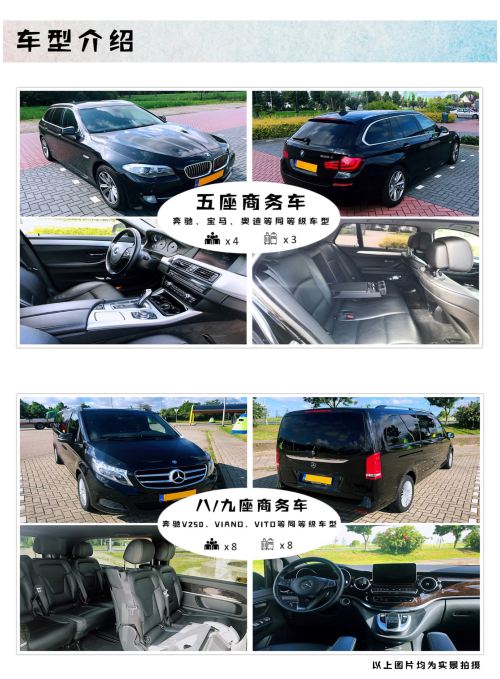 Luxury 5-seater, luxury 8/9-seater business vans, equipped with essentials such as bottled water, tissues, power banks, and umbrellas