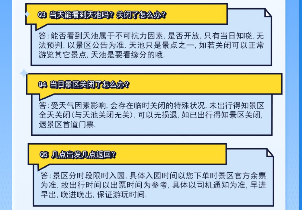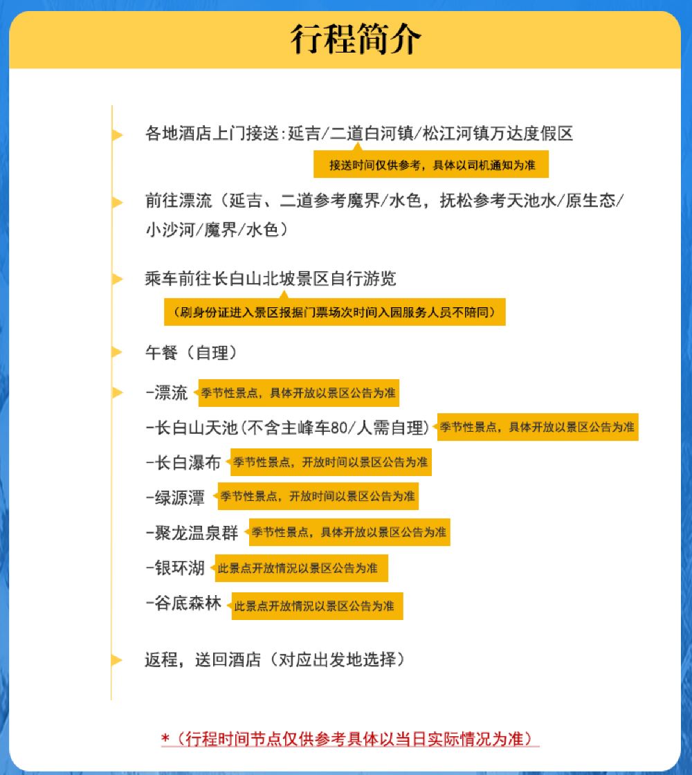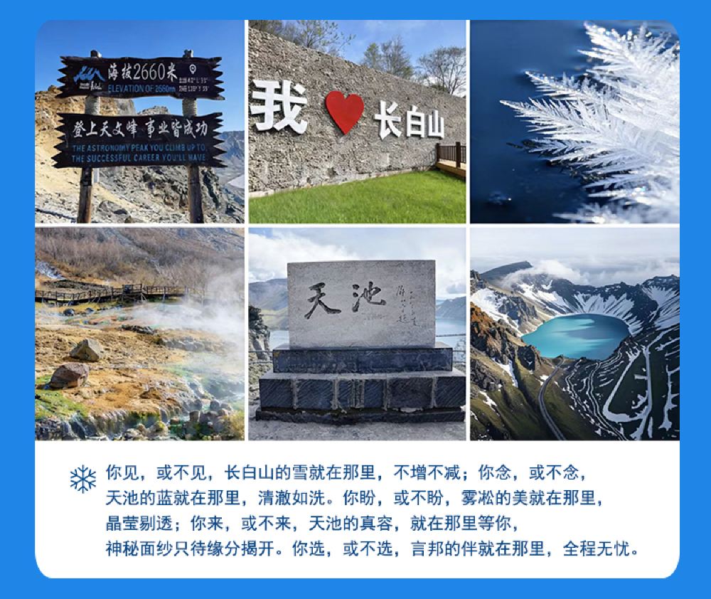 The package does not include the main peak bus ticket (80 CNY/person). After purchasing the Changbai Mountain combination ticket, you need to purchase the North Scenic Area Heaven Lake main peak bus ticket separately. Whether Heaven Lake on Changbai Mountain is open depends on the attraction's daily announcement! Service staff will not accompany you into the park.