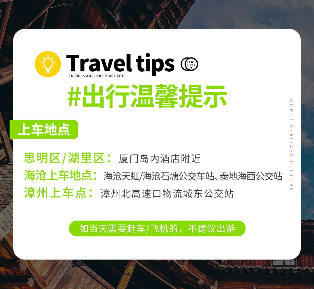 1. The itinerary time and sequence on this tour page are approximate references and subject to actual departure conditions. Staff will contact you by 10 PM the night before (please refer to the actual notification and keep your phone or SMS accessible to avoid delays). Pick-up points in Xiamen's Siming District/Huli District/near hotels with convenient parking. For Gulangyu, please return to the ferry terminal on your own. In areas where vehicles cannot stop, follow staff instructions to wait at the meeting point. Round-trip pick-up & drop-off points in Haicang: Haicang Tianhong/Haicang Shitang Bus Station, Taidi Haixi Bus Station. Round-trip pick-up & drop-off points in Zhangzhou: Zhangzhou North Expressway Exit Logistics City East Bus Station.