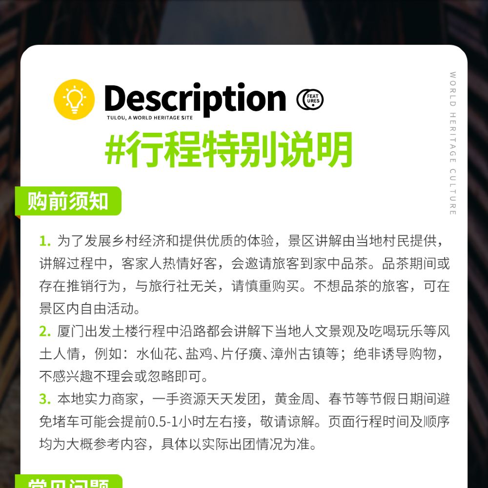 All Tulou tour routes are non-refundable and non-changeable once booked during public holidays (including New Year's Day, Lunar New Year, Qingming Festival, Labor Day, Dragon Boat Festival, Mid-Autumn Festival, and National Day) and other special dates. Due to high visitor volume, the attraction may experience congestion, requiring patience during waiting periods with no compensation provided. Some tour vehicles may operate without staff, only including local in-park commentary. Small group tours may involve shared transfer arrangements between single and double routes. We appreciate your understanding!