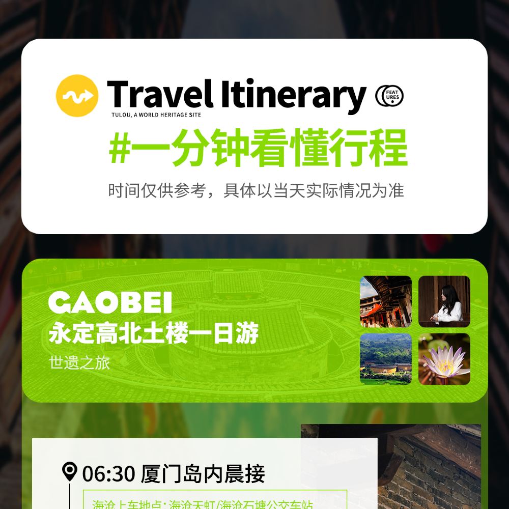 The following details are essential information for booking Tulou tours. Different packages and group sizes offer varying service items and inclusions. The itinerary sequence and time on the page are for reference only, and the actual schedule and sequence shall prevail. Multiple attractions may actually refer to the same location with different names.