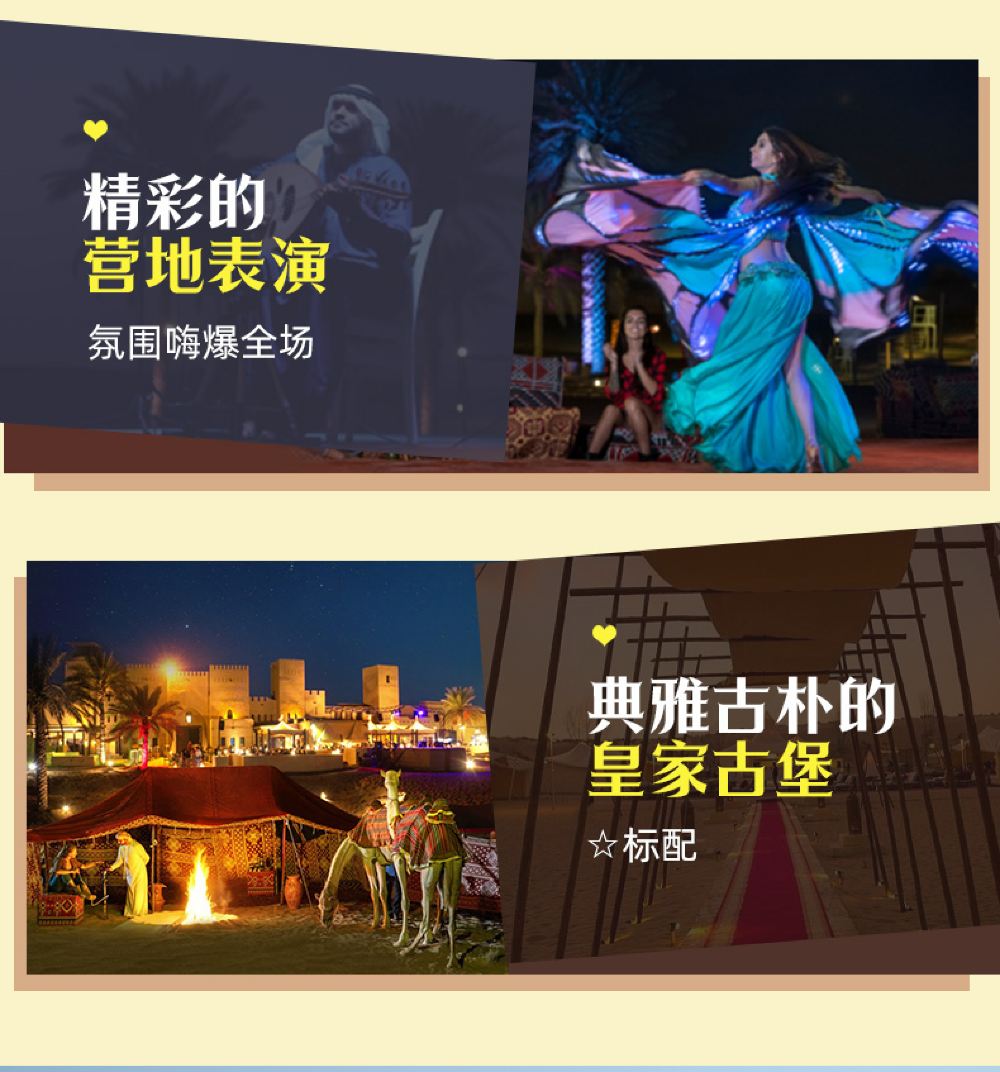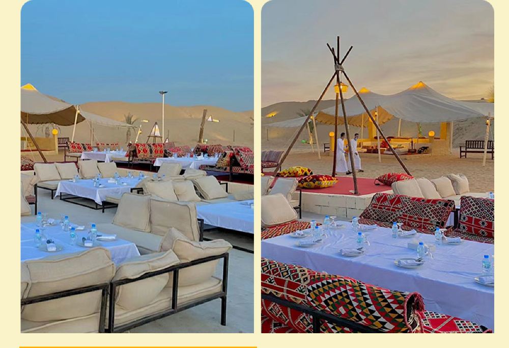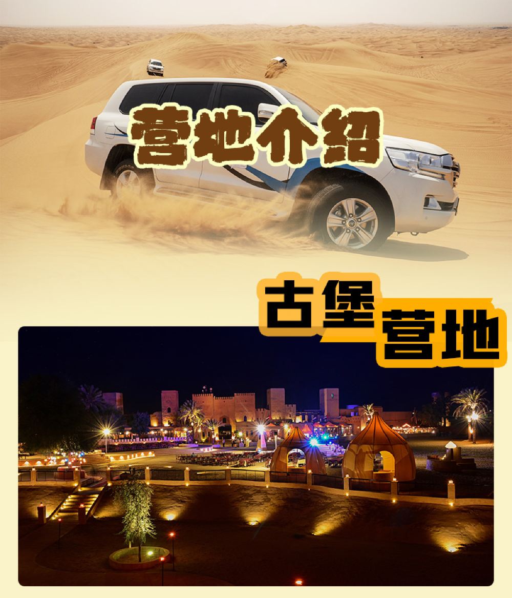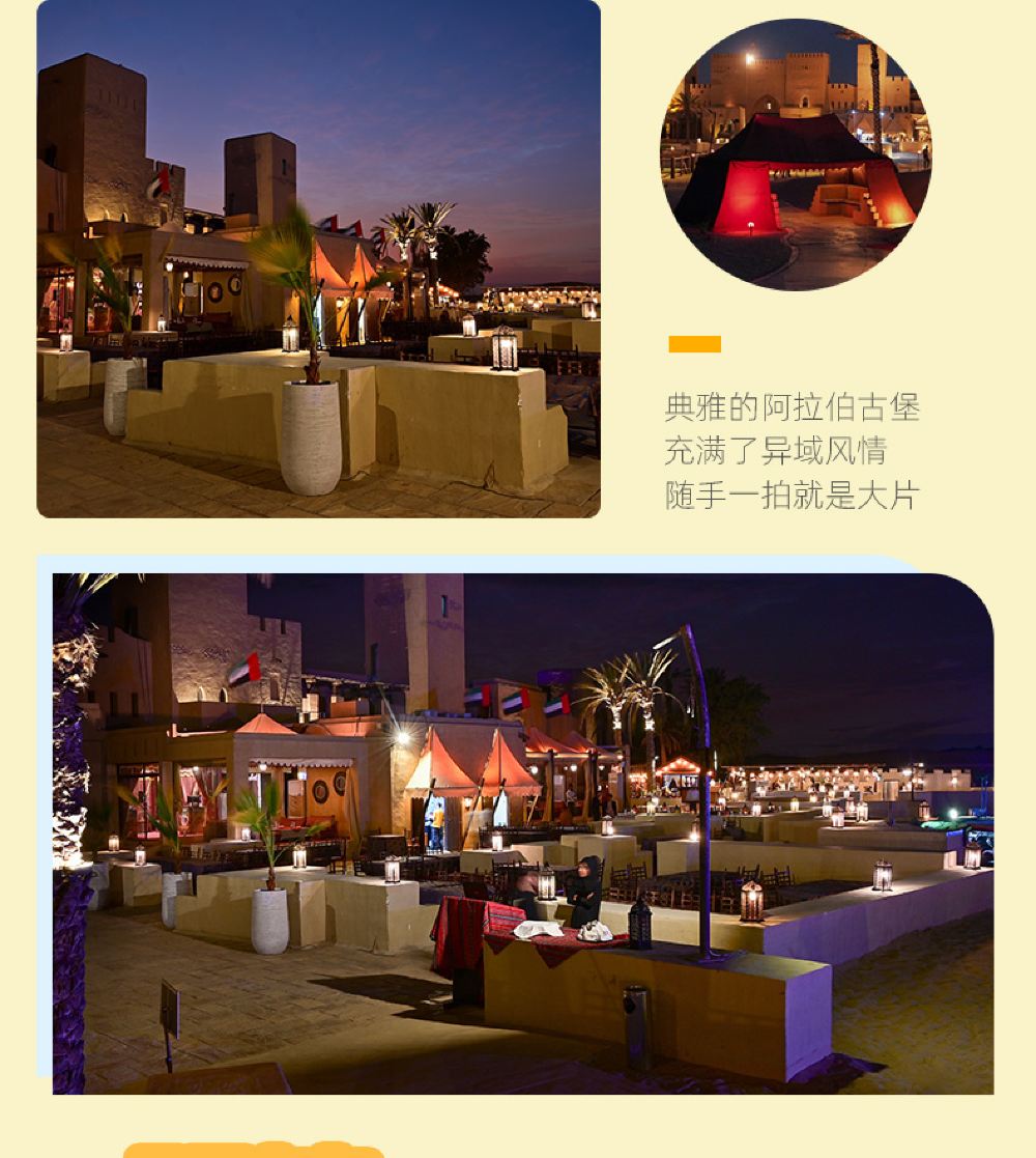 An Arabian royal castle-style architecture, immersing yourself in the high-end luxury camp of One Thousand and One Nights; Special option: Desert Oasis Camp dune bashing, with optional pick-up service