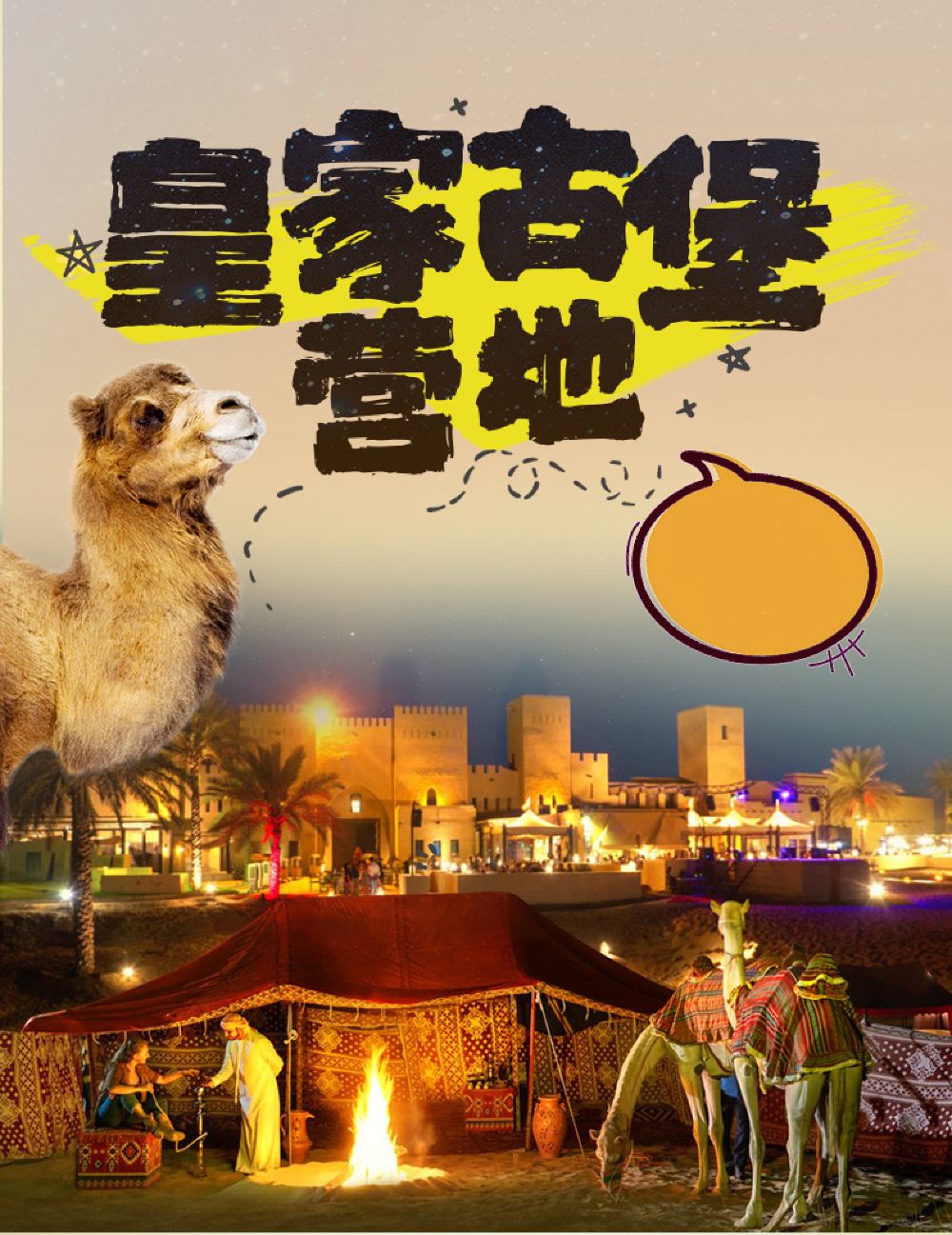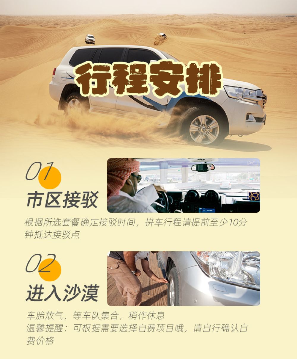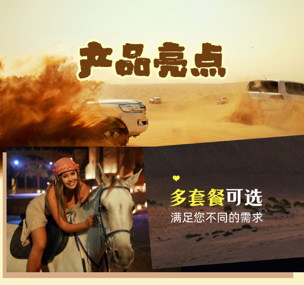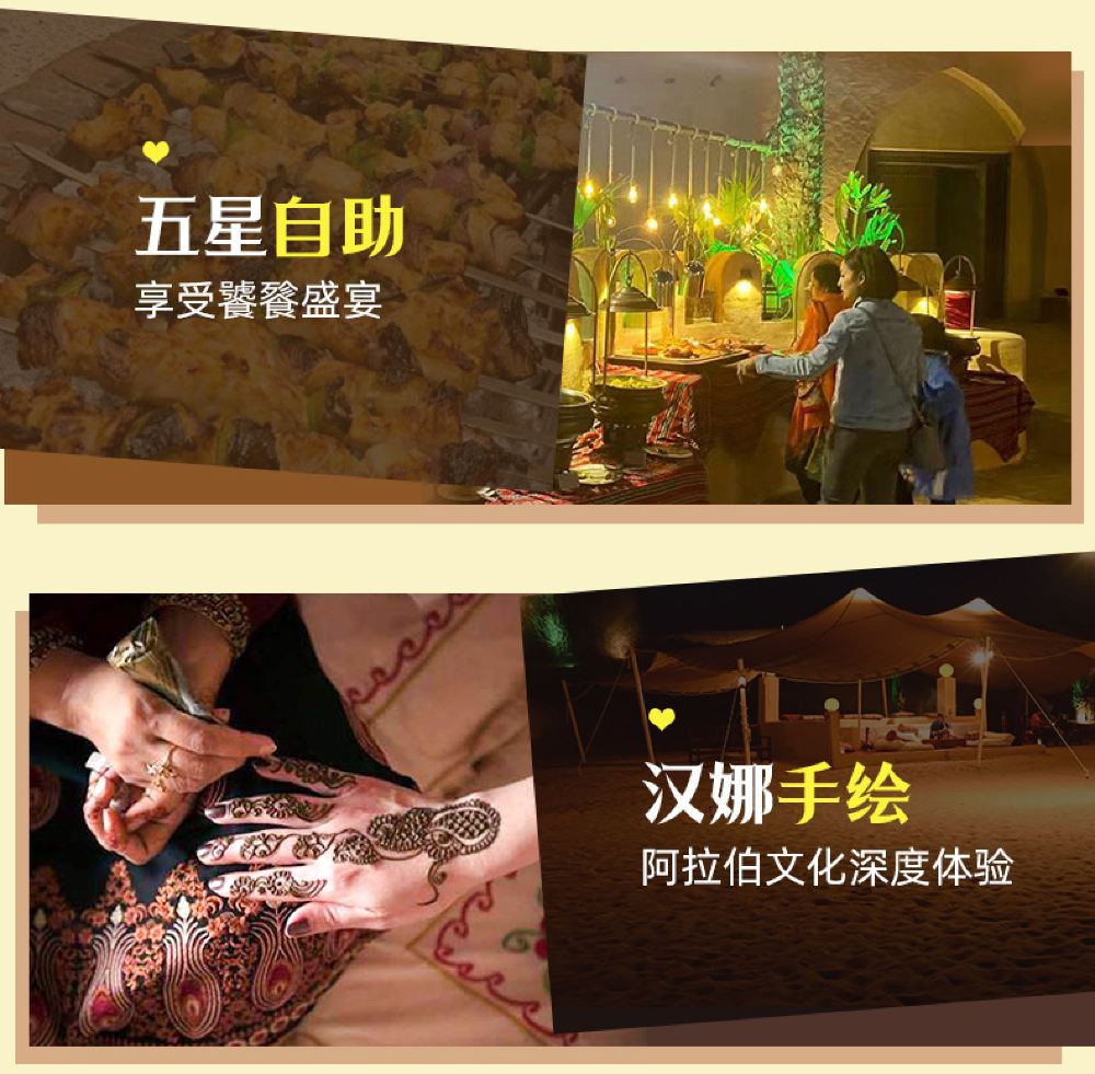 An Arabian royal castle-style architecture, immersing yourself in the high-end luxury camp of One Thousand and One Nights; Special option: Desert Oasis Camp dune bashing, with optional pick-up service