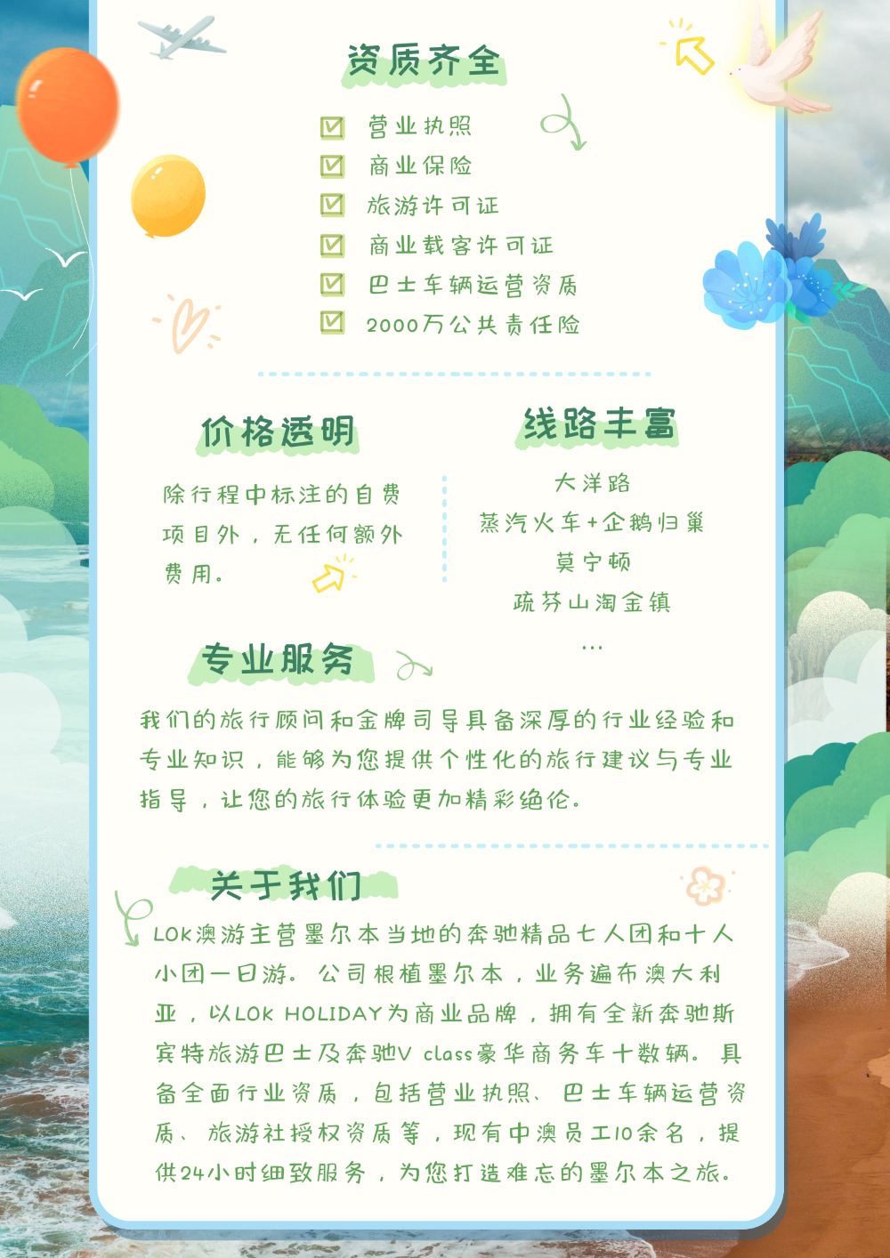 Carefree travel with carefully selected Chinese-speaking drivers and guides and a Anytime in opening hours customer service Group