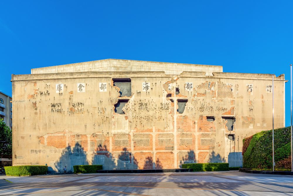 ▲ The west wall displays the original appearance of the Songhu Battle in 1937. 8 giant shell holes and more than 420 bullet holes have been restored through precise detection and positioning, making it a rare living display of war relics in China.