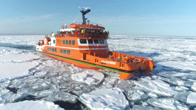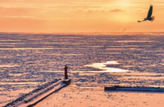▲ Sail through the drift ice of the Sea of Okhotsk aboard the icebreaker Garinko III, and feel the thrill of the bow propeller breaking through the ice. As the sun slowly sinks below the horizon, the silvery white drift ice is stained golden orange, creating a magnificent and mysterious winter landscape.