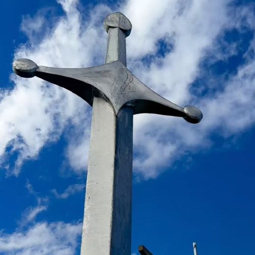 Dozens of giant swords embedded in the hillside sway with wind chimes, creating a sound reminiscent of clashing blades.