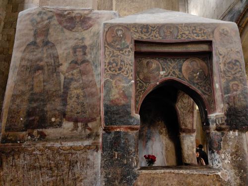 Pillar of Life Cathedral: A highly symbolic and historic Georgian Orthodox church, where ancient stone bricks bear the flickering light and shadow of historical frescoes; prayer candles send wisps of smoke spiraling upward.