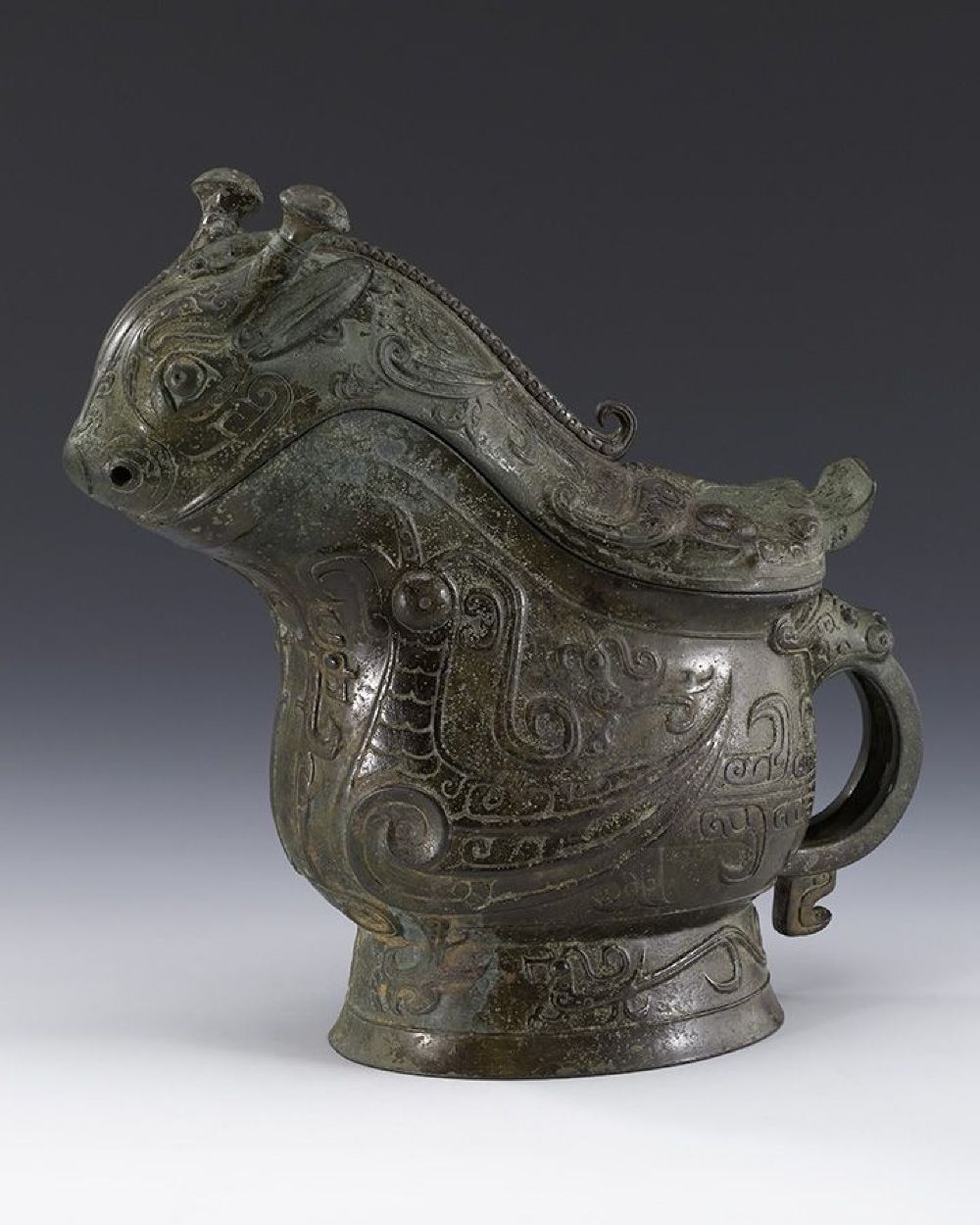 ▲ The {Ju} Fu Yi Gong wine vessel features a remarkably eye-catching design that incorporates characteristics of various animals. The front of the lid depicts a mythical dragon head with inward-curving horns featuring small hook-like branches (resembling deer antlers), long rabbit-like ears, and wide-open eyes. Behind each horn coils a small snake, while a raised ridge running from the forehead to the back is decorated with a standing relief of a small dragon featuring a slender, curled tail. The rear section shows an ox head with prominent horns and an upturned long tongue.