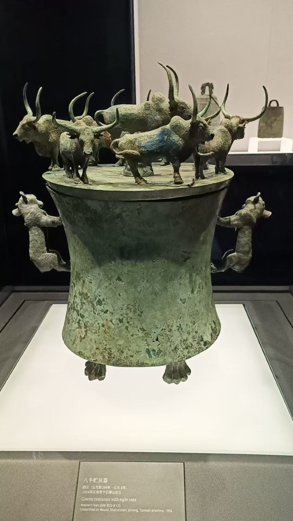 ▲ The eight-oxen coin storage vessel is a distinctive and iconic type of Dian-style bronze artifact. Cowrie shells were extremely rare in ancient inland regions and often served as currency. The vessel lids are adorned with three-dimensional decorative motifs featuring diverse themes. The Dian people frequently used animal imagery such as oxen and tigers. Scenes of daily life and ritual ceremonies also appear, with some lids depicting over a hundred human figures.