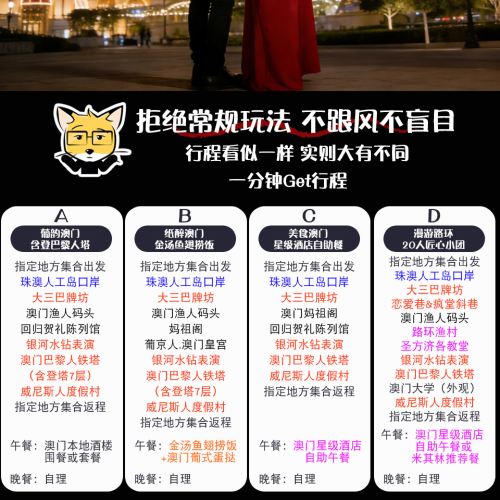 Departing from Shenzhen/Guangzhou/Zhuhai/Macau, meet at the Macau Departure Hall of Zhuhai Port►Ruins of St. Paul's►A-Ma Temple►Handover Gifts Museum of Macau►Macau Global Buffet►Parisian Tower (exterior view)►Galaxy Diamond Show►The Venetian Macao Resort Hotel►Return