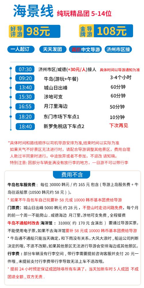 2. Advantages: Small group of 5-14 people with high price and good reviews. Chinese/Mandarin guide. Hotel pick-up in Jeju city. Local travel agency in Jeju Island.
