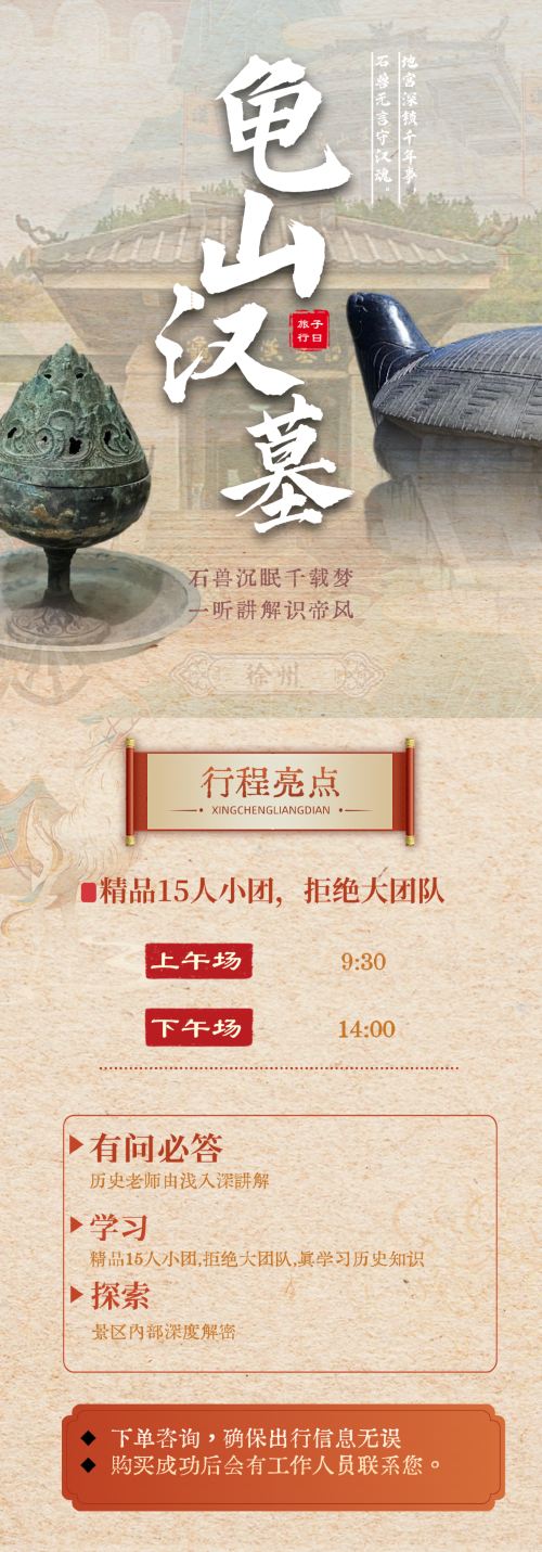 9:30 AM and 2:00 PM, gather 10 min before the session startsThe meeting point is at the small square near the ticket office of Guishan Han Tomb.Please arrive at the designated location on time as the tour will depart punctually.