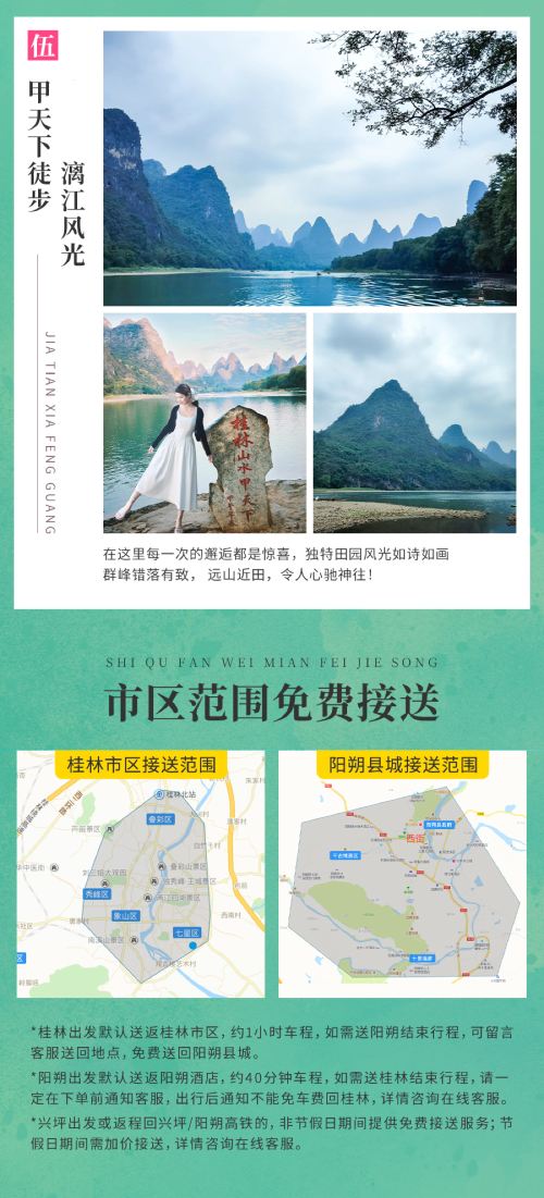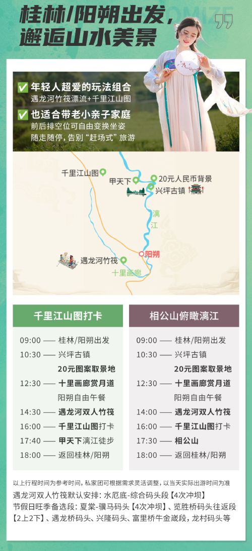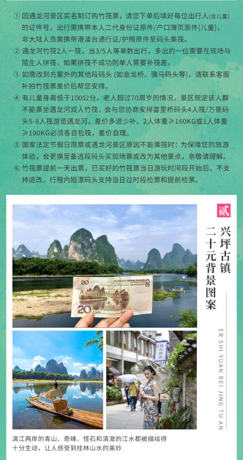 This itinerary includes [Xingping Ancient Town + Li River Scenic Area 20 CNY Background Photo Spot + Yulong River Bamboo Raft + Thousand Miles of Rivers and Mountains Painting + World's Best Li River Scenic Area Hiking]