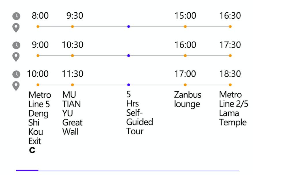 ▲ ---------- overview ---------- Departs from: Beijing Attractions: Mutianyu Great Wall Duration: 8-9 hrs (about 1,5 hrs for one way transfer) Departure time: 8:00 9:00 10:00am (daily) Pick-up point: The Regent Hotel parking lot, Subway line 5 [Dengshikou Station] Exit C Return time: 3:00 4:00 5:00pm (daily) Drop-off point: The Lama Temple Subway line 2/5