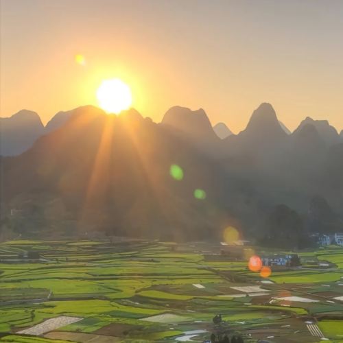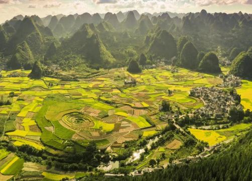 ▲ The Bagua Terraces are a disc-shaped, funnel-like farmland composed of over 30 funnels of varying sizes. The fields spiral along the edges of the funnels, their contours unfolding like the patterns of the Bagua (Eight Trigrams). In spring, the terraces are lush green, while in autumn, they turn golden. During the rainy season, the water-filled funnels reflect the surrounding peaks, resembling the "pupils" of the earth—a quintessential example of karst negative topography.