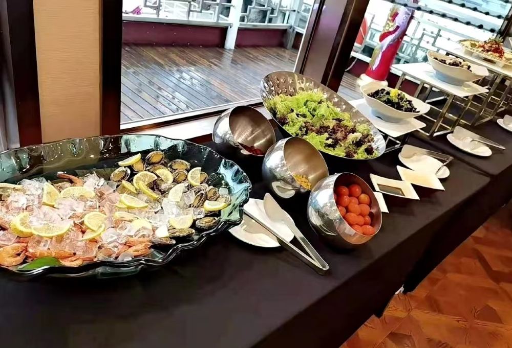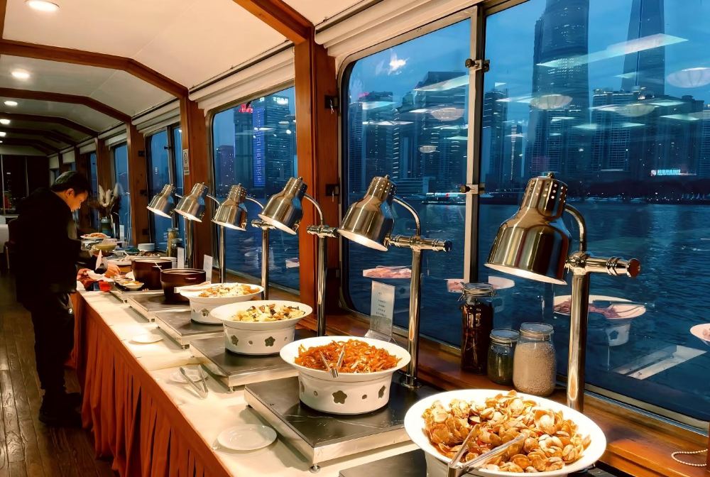 ▲ The Huangpu River Night Cruise on the Dragon Boat primarily focuses on night views. To ensure visitors don't miss the beautiful scenery, a complementary dining service is provided. Although the buffet features Jiangnan and Shanghai-style cuisine prepared by a professional chef team, those who are particular about dining quality and ambiance should consider carefully before purchasing this product. The Dragon Boat has a maximum capacity of 1,000 visitors, and during peak times, it can get crowded. For the best dining experience, board between 17:00–17:30 when the buffet starts at 17:30, as dishes will be fully stocked. Dining around 18:00 or later may result in delayed dish replenishment.