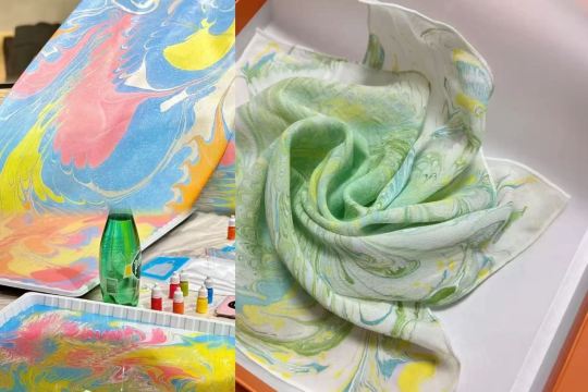 - The creation of water-marbled silk scarves utilizes the magical principle of water marbling. This technique primarily takes advantage of water's surface tension by dripping specially formulated pigments onto the water's surface. These pigments naturally expand, flow, and blend on the water, forming various marvelous and vibrant patterns. The silk scarf is then gently laid onto the water's surface, allowing the pigments to adhere to it. After specific treatments, a one-of-a-kind water-marbled design is achieved.