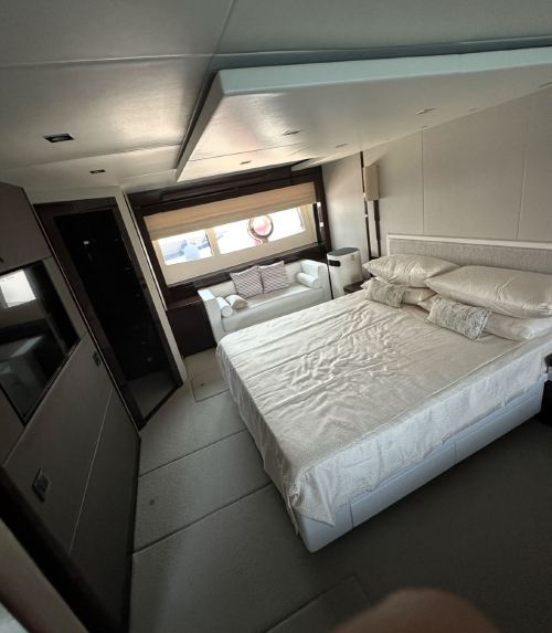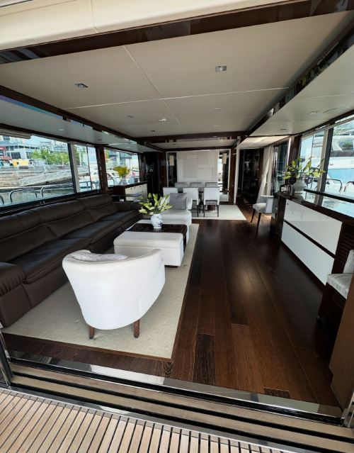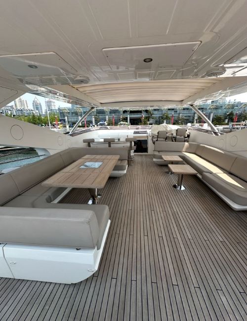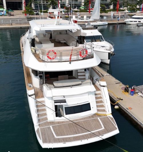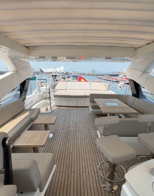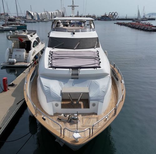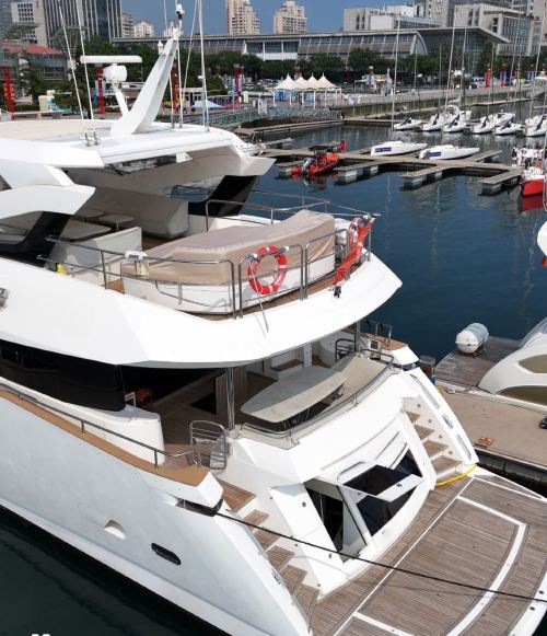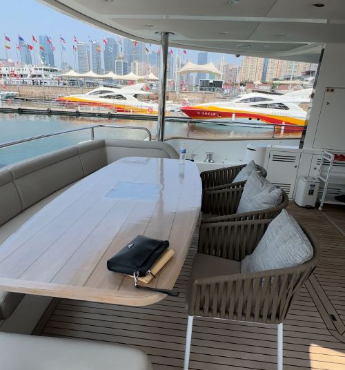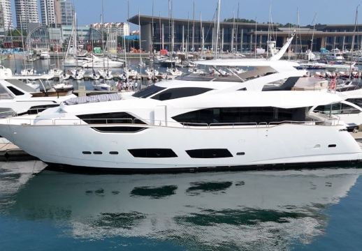 Qingdao Yacht Charter: 95-foot British-imported Sunseeker yacht rental at Qingdao Olympic Sailing Center, including KTV, fruits and beverages, and yacht driving experience. The super luxurious yacht is like a floating palace, perfect for parties and high-end events.