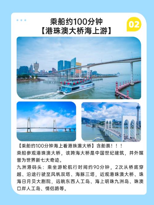 No need for an Entry-Exit Permit for Hong Kong and Macau to view the Hong Kong-Zhuhai-Macau Bridge; take a cruise to see the bridge, pass under it twice, and enjoy a 360-degree close-up view of the Hong Kong-Zhuhai-Macau Bridge.