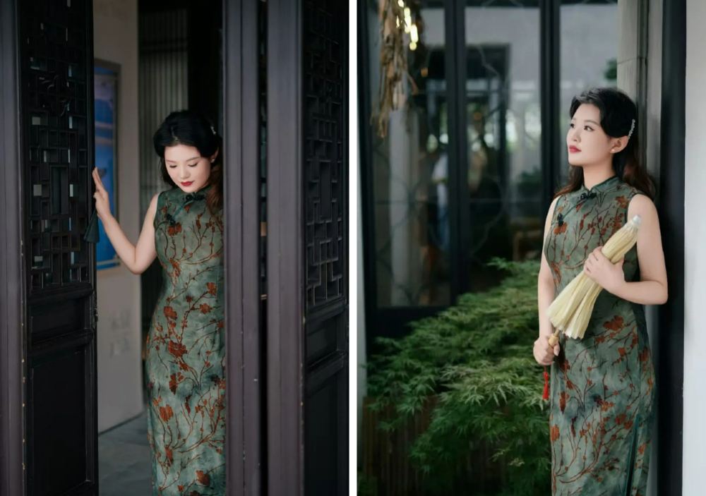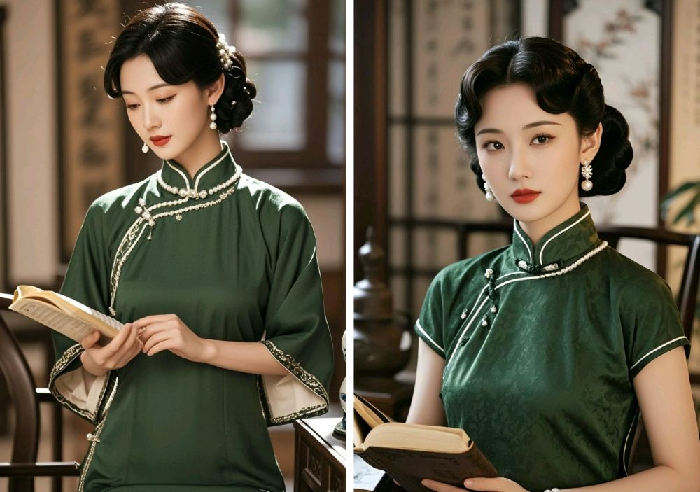 - The figure is dressed in a dark green cheongsam adorned with elements like pearls, featuring an overall design that is exquisite and elegant.