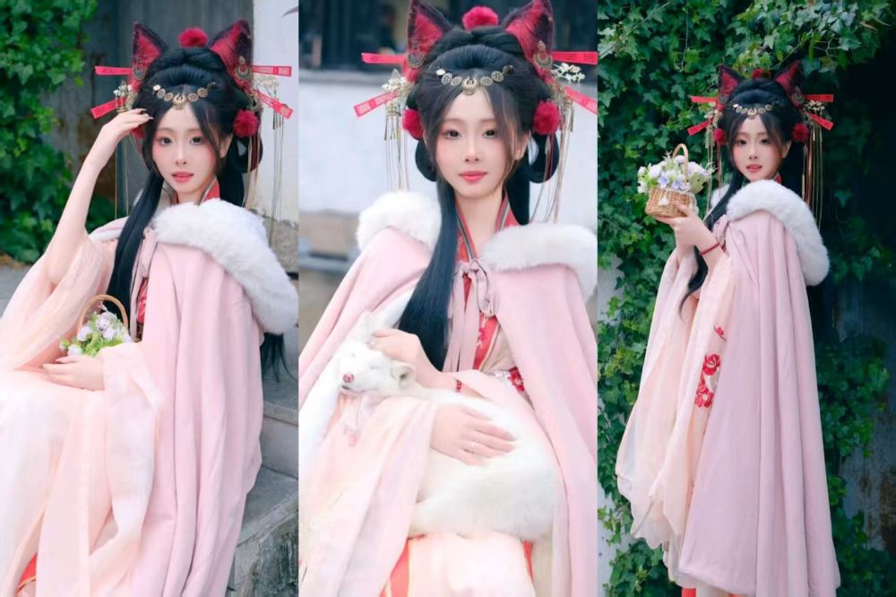 - A pink cape paired with a fluffy collar and delicate hair accessories. Playful and charming, with green plants in the background adding a natural touch.
