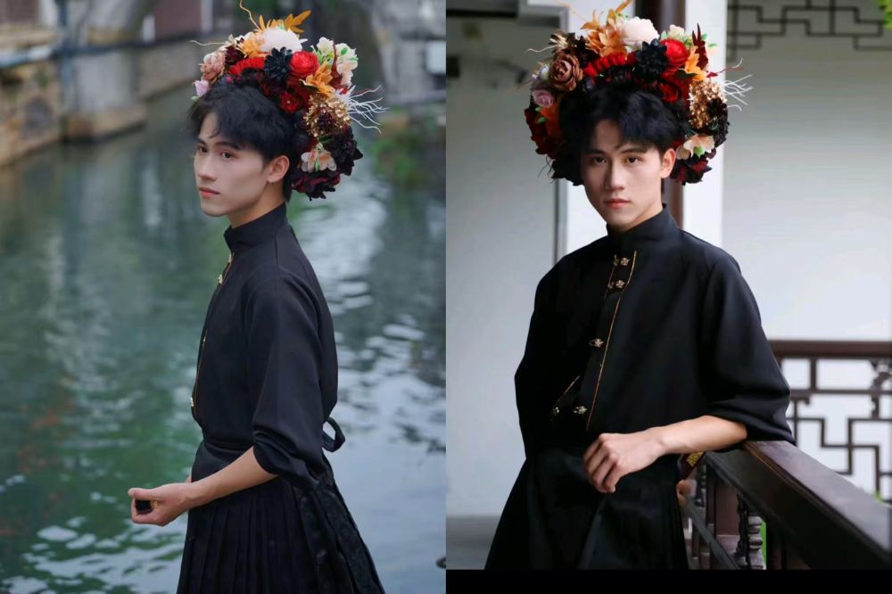- A man wearing a floral headpiece and black traditional attire stands by the riverside, leaning against the railing, showcasing a unique blend of tradition and fashion in this distinctive ensemble.